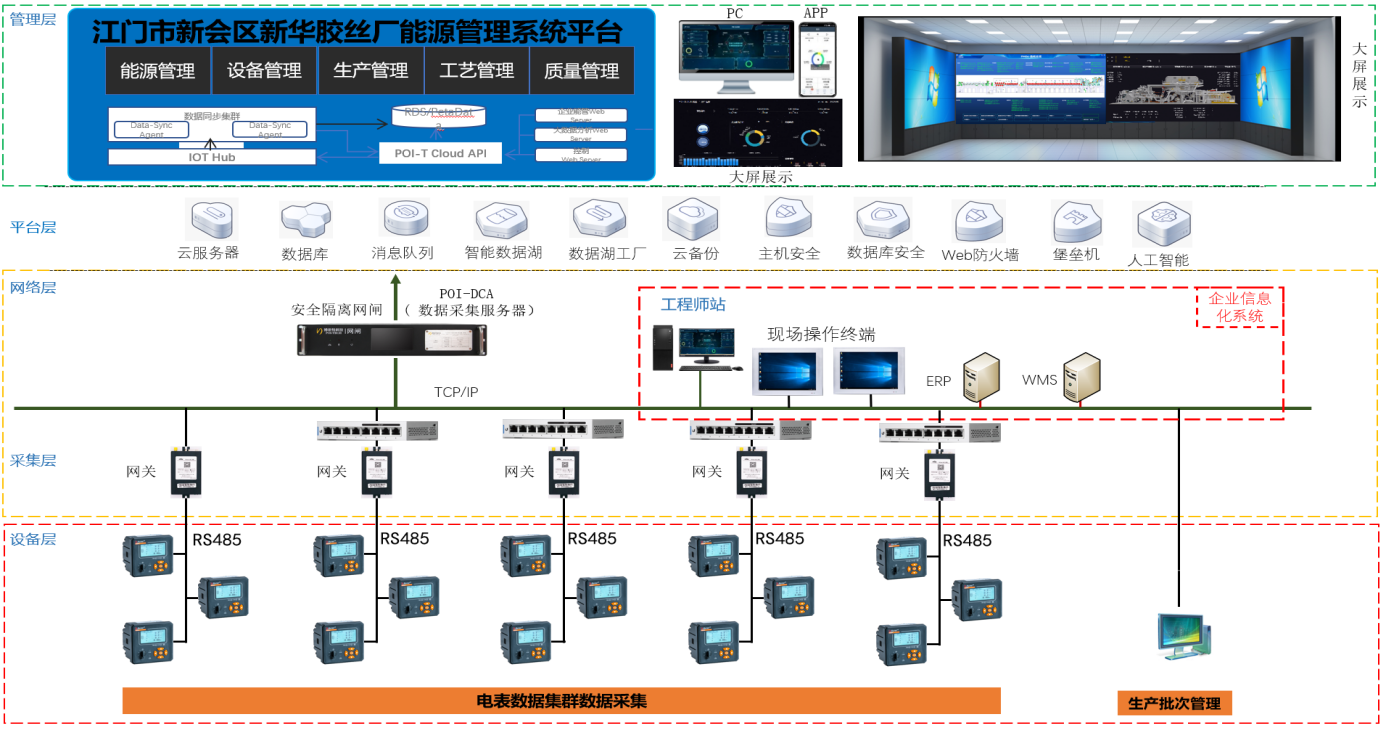 面向場景:打造了一套新華膠絲廠能耗在線監測管理系統平臺,具備與ERP等上層信息系統,以及一期項目的工廠數字化制造運營系統、現場儀器儀表、設備的集成能力,并將這些實時數據存入本地MySQL數據庫,為未來企業發展新系統的集成,打下穩定、擴展性的基礎。