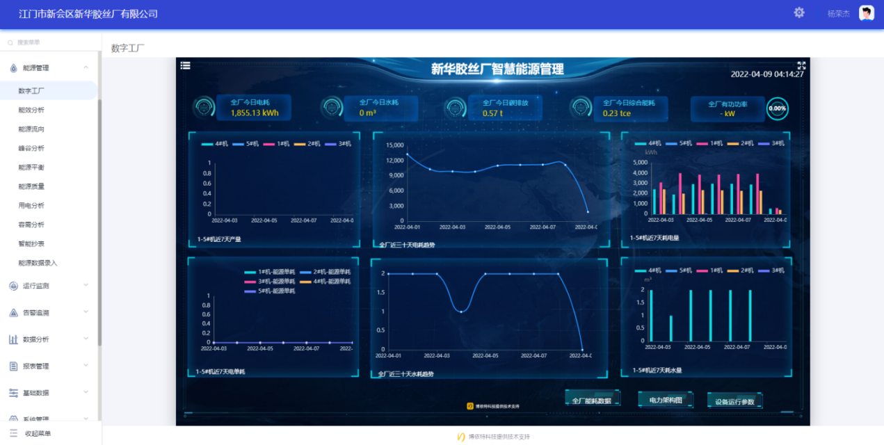 第一,打造了新華膠絲廠能源數字工廠。通過能耗在線監測系統實現對新華膠絲廠生產過程中能源消耗進行監測和生產批次管理數據對接,實時顯示新華膠絲廠4條生產線能耗、單耗等數據,組態化大屏形式展示關注的能源指標,實現獨立靈活自適配,符合各種生產實際場景需求。任意關鍵數據指標適配;豐富圖表、設備組件;配置靈活,即時生效,靈活調整;實時業務指標、視頻監控融合。
