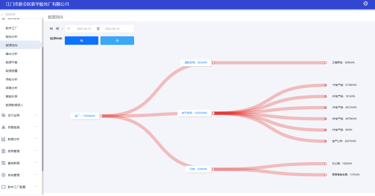 新華膠絲廠生產能源流向動態監測(全廠→生產車間→生產線→重點耗能設備等);通過能源流向圖,可以查看能源消耗的去向,也可以查看不同區域能源利用比例情況。該能流圖能夠實時顯示生產過程中不同能源的消耗數據。