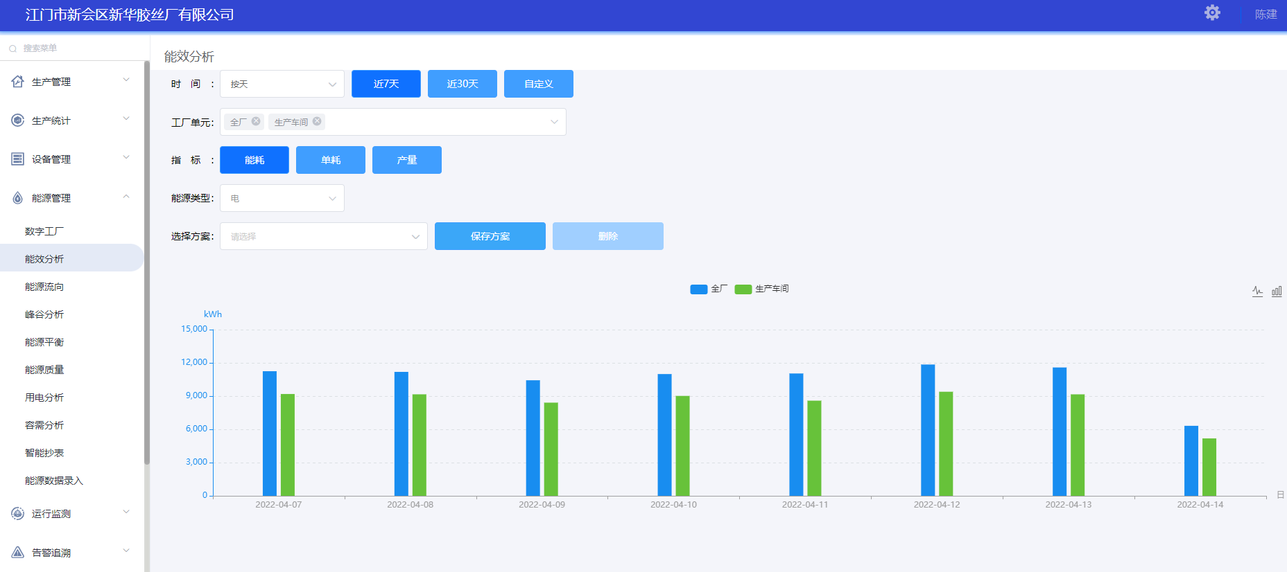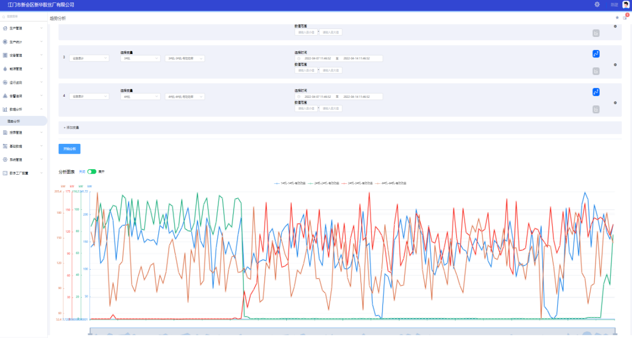 新華膠絲廠能效分析具有強大的歷史能耗數據追溯和分析功能,多維度分析企業不同生產區域/設備的能耗、能效水平及產量,可隨時查看某個區域/設備、時間、班組的能耗、能效、產量波動情況,通過動態的圖形顯示,快速了解是否有異常情況,從而對生產、管理、工藝及時進行指導和調整,使新華膠絲廠生產過程的單位能耗和能源效率保持在科學、合理水平。