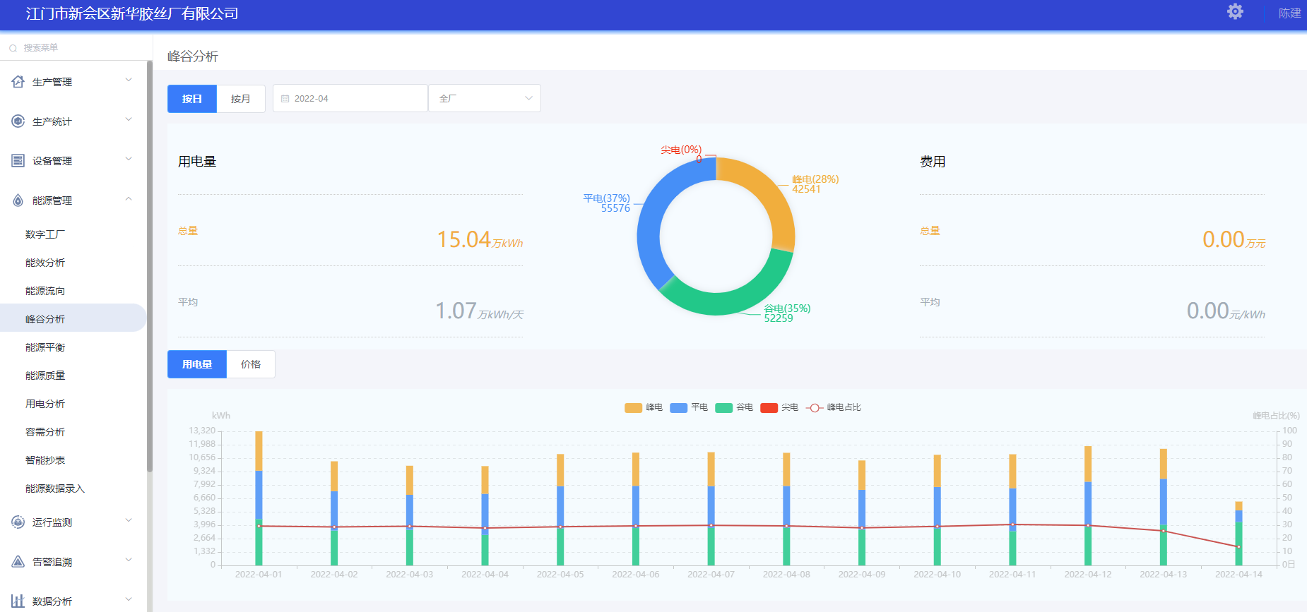 新華膠絲廠生產用電峰谷平數據在線監測,反映企業錯峰用電實際狀況、錯峰用電占比情況。對企業歷史用電量及電費(錄入)進行統計分析,有助于合理調度高耗能設備啟停區間,減少峰電比例,節約生產能源成本。展示各廠峰谷用電的實物量及占比,通過峰谷平用電比例指導車間及工序合理排產,提高用電的效率和經濟性。