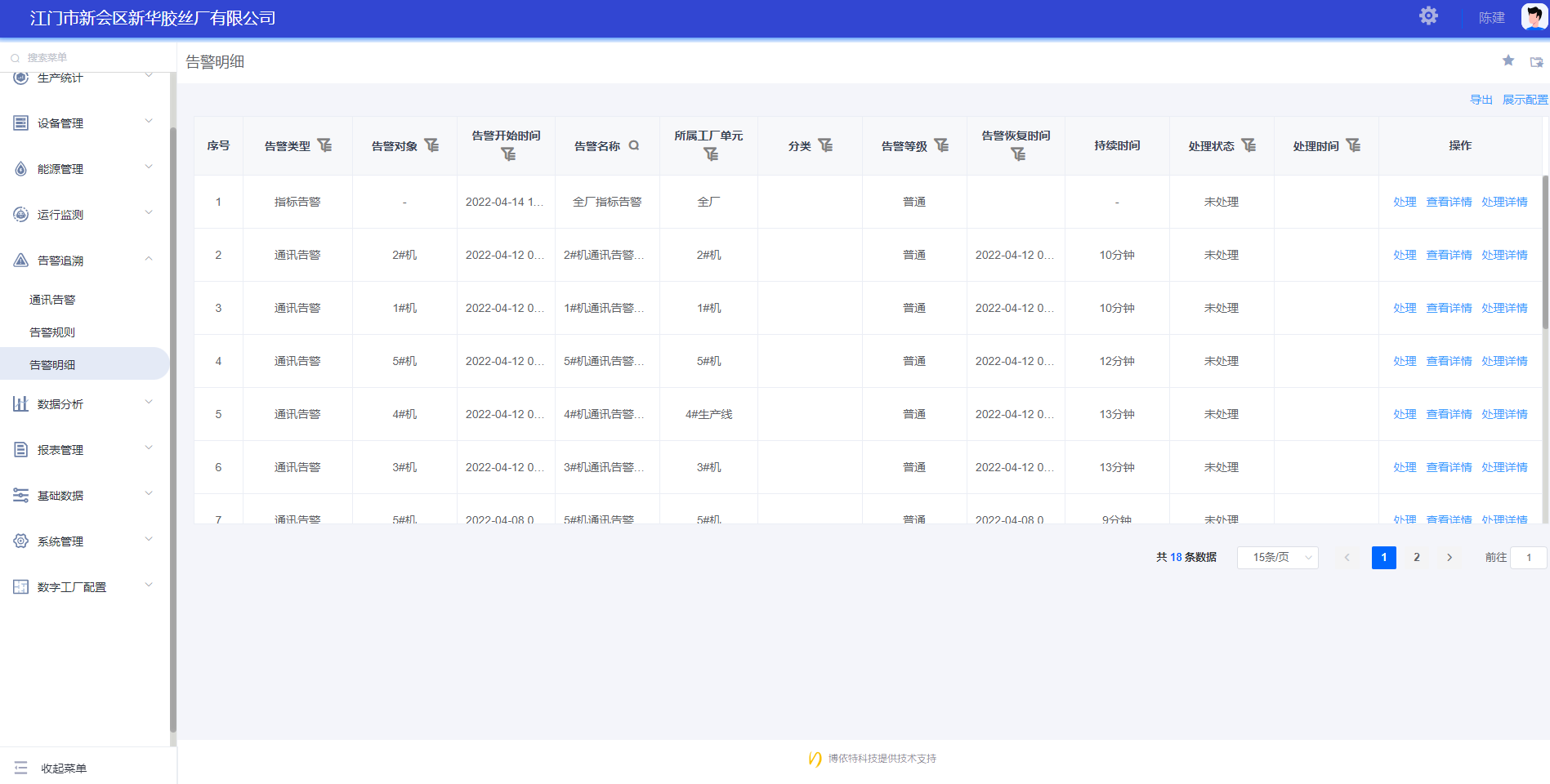 告警追溯模塊實現設備運行異常、能耗異常等生產異常實時告警與追溯。所有報警變量及其上、下限新華膠絲廠可以自定義,當發生異常時,對應的工段或者設備以閃爍、改變顏色或發短信等告警形式提醒相關人員。告警晴雨表以廠區拓撲圖(工廠模型)的形式直觀展示,告警類型包括通訊告警、指標告警、參數告警。