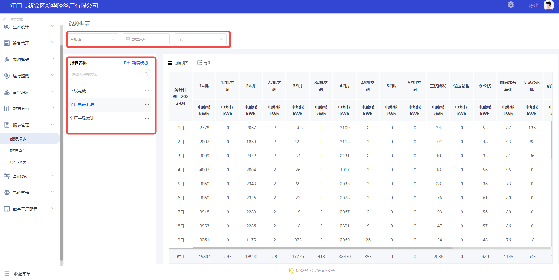 報表是新華膠絲廠生產數據匯總的主要形式。報表管理模塊分為定制化報表和自定義報表兩大類別,實現自動抄表;能耗報表自動生成;并支持用戶進行自定義報表。報表管理模塊能夠有效解決企業生產報表種類、數據量繁多,統計耗時長,工作量大等問題,同時能夠提高報表數據的準確性和實時性。(報表支持EXCEL導出)。