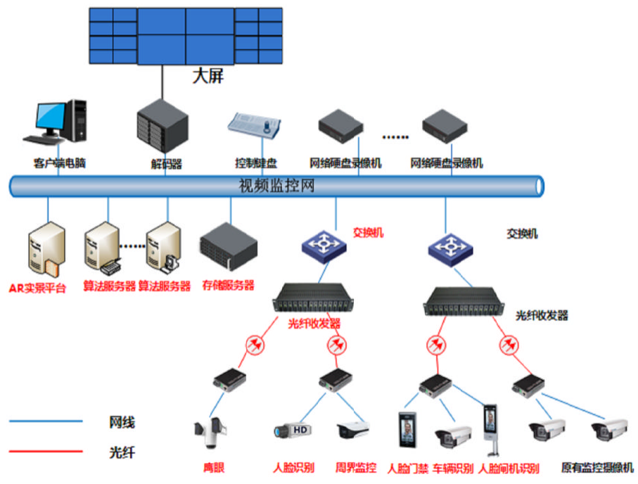 感知層:系統(tǒng)前端感知設(shè)備包含AR攝像頭、普通監(jiān)控?cái)z像頭,人臉識(shí)別攝像機(jī)、車(chē)牌攝像機(jī)、周界防范攝像機(jī)、明火檢測(cè)攝像機(jī)等告警終端/系統(tǒng)。