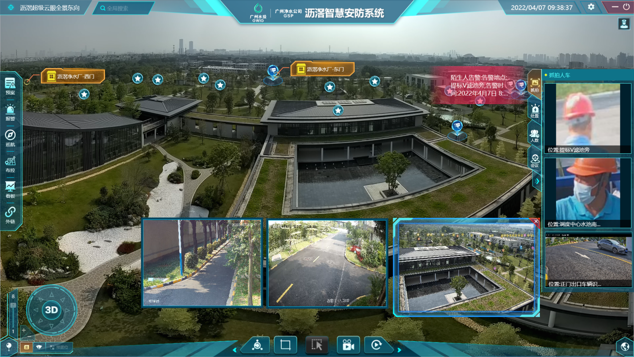 廣州凈水公司瀝滘凈水廠面向水務(wù)行業(yè)的需求,建設(shè)智慧安防系統(tǒng),構(gòu)建以實(shí)景地圖為載體的的智慧安全防護(hù)體系,支撐基于“無(wú)人值守、少人巡檢”智慧凈水廠的落地。其本質(zhì)在于完成凈水廠安全防護(hù)智慧化全面升級(jí),實(shí)現(xiàn)園區(qū)安全管理的智能化、標(biāo)準(zhǔn)化及規(guī)范化,達(dá)到宏觀細(xì)節(jié)、虛實(shí)結(jié)合、內(nèi)外互補(bǔ)的“四圖合一”增強(qiáng)效果,以提升凈水廠安全管理要素、安全管理決策等全方位的智慧化水平,形成資源富集、場(chǎng)景豐富、告警閉環(huán)、高低聯(lián)動(dòng)的安防生態(tài)。